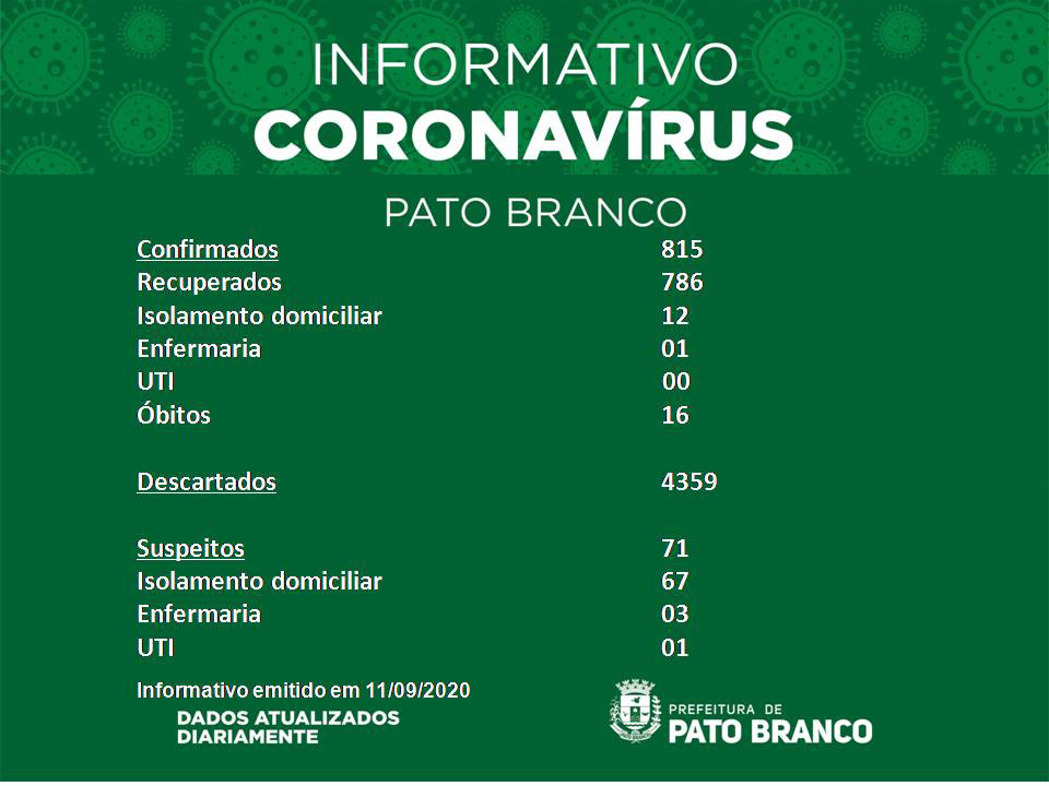 Boletim da Secretaria Municipal de Saúde informa o registro de novos casos em Pato Branco. De 812 para 815 casos de Covid-19, 16 óbitos, suspeitos 71, recuperados 786, 04 internados em enfermaria e 01 em UTI, isolamento social 67. Casos descartados 4.359.