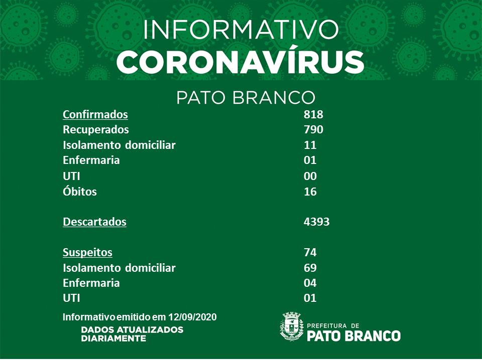 Boletim da Secretaria Municipal de Saúde informa o registro de novos casos em Pato Branco. De 815 para 818 casos de Covid-19, 16 óbitos, suspeitos 74, recuperados 790, 05 internados em enfermaria e 01 em UTI, isolamento social 80. Casos descartados 4.393.