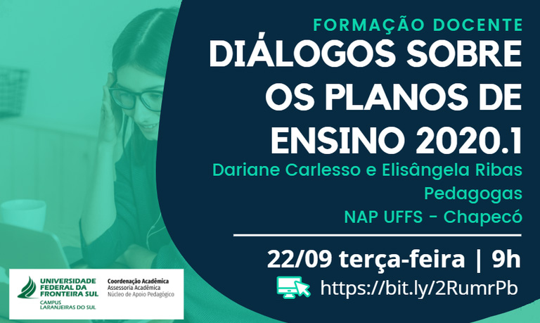 O Núcleo de Apoio Pedagógico (NAP) e a Coordenação Acadêmica da UFFS – Campus Laranjeiras do Sul promovem mais uma etapa de formação docente do ano de 2020. A atividade agendada para a próxima terça-feira, dia 22 de setembro, tem como título “Diálogos sobre os planos de ensino 2020.1”. A transmissão será realizada no YouTube UFFS – Campus Laranjeiras do Sul, a partir das 9h.
