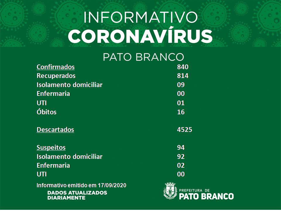 Boletim da Secretaria Municipal de Saúde informa o registro de novos casos em Pato Branco. De 839 para 840 casos de Covid-19, 16 óbitos, suspeitos 70, recuperados 814, 02 internados em enfermaria e 01 em UTI, isolamento social 101. Casos descartados 4.425.