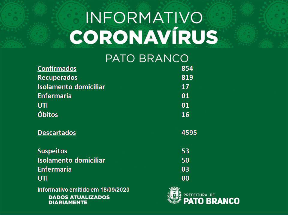 Boletim da Secretaria Municipal de Saúde informa o registro de novos casos em Pato Branco. De 840  para 840 casos de Covid-19, 16 óbitos, suspeitos  53, recuperados 814, 04  internados em enfermaria e 01 em UTI, isolamento social 67. Casos descartados 4.495.