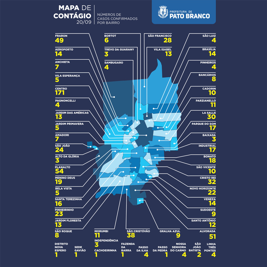 O Centro é o local de com a maior concentração de casos, segundo o local de residência do paciente, com 171 ocorrências. Os demais casos em bairros. Os bairros com maior incidências são: Planalto com 54 casos, Fraron 49 casos, Alvorada com 51 e São Cristóvão 38 ocorrências.