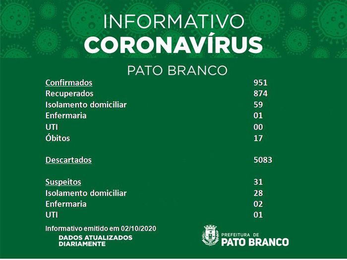 Boletim da Secretaria Municipal de Saúde informa o registro de novos em Pato Branco. De 942 para 951 casos de Covid-19, 17 óbitos, suspeitos 31, recuperados 874, e 02 internados em enfermaria, nenhum paciente em UTI. Isolamento social 87. Casos descartados 5 083.