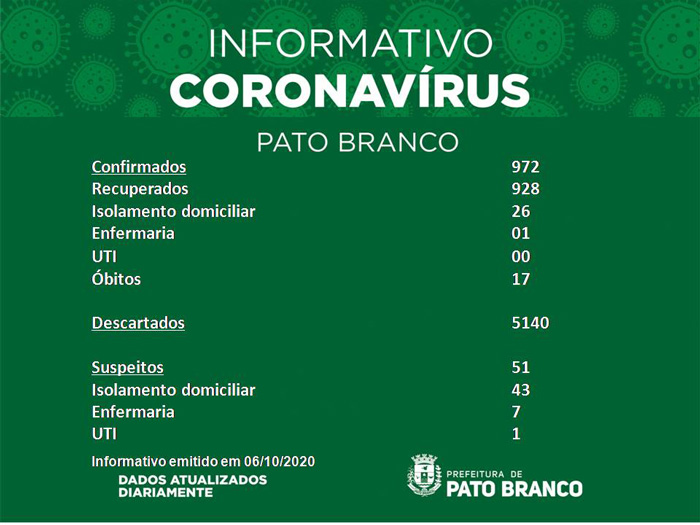 Boletim da Secretaria Municipal de Saúde informa o registro de   novos  em Pato Branco. De 964 para 972 casos de Covid-19, 17 óbitos, suspeitos 51, recuperados 928. Sete  internados em enfermaria e 02 pacientes em UTI. Isolamento social  69. Casos descartados 5.140.