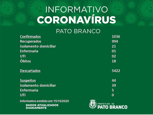 Boletim da Secretaria Municipal de Saúde informa o registro de novos em Pato Branco. De 1030 para 1036 casos de Covid-19, 18 óbitos, suspeitos 44, recuperados 994. Seis pacientes internados em enfermaria, 02 pacientes em UTI. Isolamento social 60. Casos descartados 5.422.