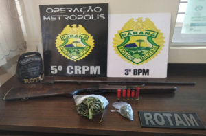 Bom Sucesso do Sul: Dentro da Operação Metropólis, a equipe da Rotam do 3º BPM, na manhã de domingo (18), durante patrulhamento na Linha São Cristóvão, Zona Rural de Bom Sucesso do Sul, abordou em via pública um adolescente que trazia consigo 5g de substância análoga à maconha, e na sequência em sua residência foram encontradas mais 95 g do entorpecente, uma espingarda, cal. 36, marca CBC, sem registro, e 5 cartuchos cal. 36, sendo um deles deflagrado. O adolescente juntamente com o material apreendido foi encaminhado polícia judiciária.