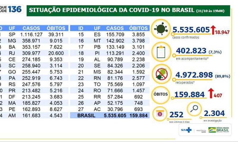 O Ministério da Saúde Brasil confirmou mais 407 mortes decorrentes de complicações causadas pelo novo coronavírus. O país soma 159.884 óbitos causados pela covid-19 desde que o primeiro caso da doença foi registrado no país, no fim de fevereiro deste ano.