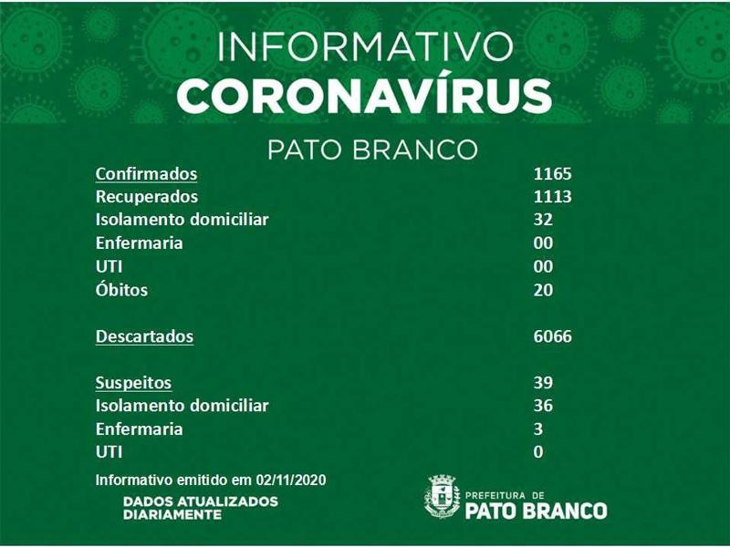 Boletim da Secretaria Municipal de Saúde informa o registro de novos em Pato Branco. De 1.162 para 1.165 casos de Covid-19, 20 óbitos, suspeitos 39, recuperados 1.113. Três pacientes internados em enfermaria e nenhum paciente em UTI. Isolamento social 68. Casos descartados 6.066.