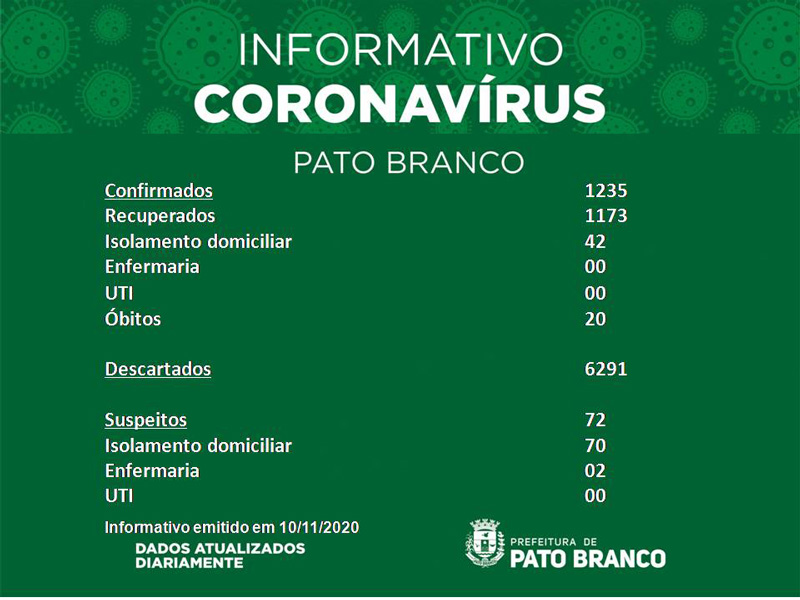 Boletim da Secretaria Municipal de Saúde informa o registro de novos em Pato Branco. De 1.229 para 1.235 casos de Covid-19, 20 óbitos, suspeitos 72, recuperados 1.173. Dois pacientes internados em enfermaria e nenhum paciente em UTI. Isolamento social 112. Casos descartados 6.291.
