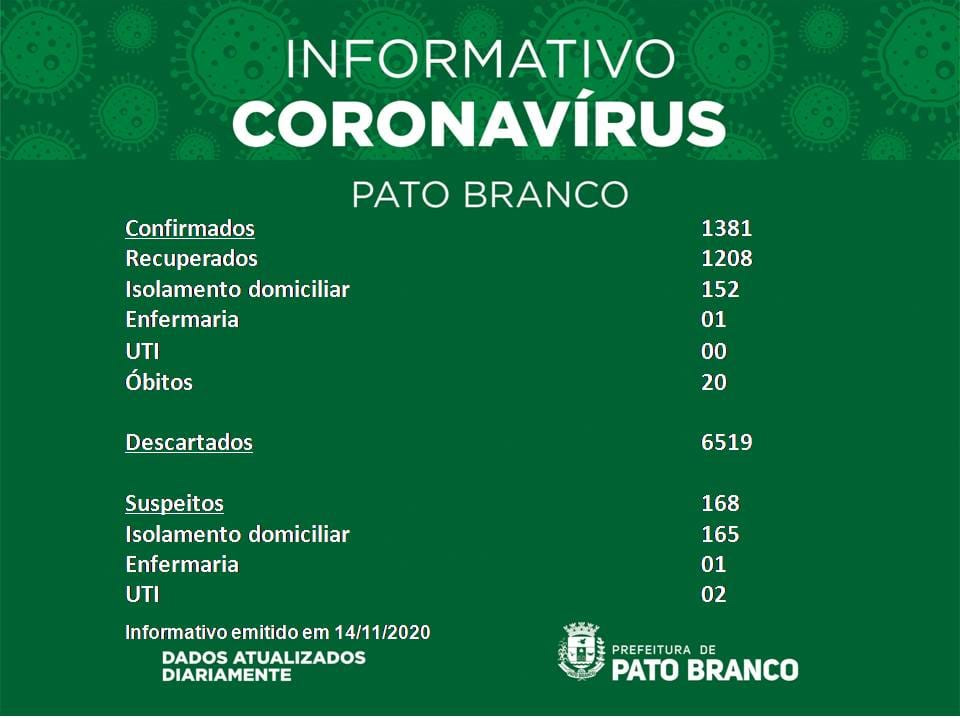 Boletim da Secretaria Municipal de Saúde informa o registro de novos em Pato Branco. De 1.341 para 1.381 casos de Covid-19, 20 óbitos, suspeitos 168, recuperados 1.207. Um paciente internado em enfermaria e 2 pacientes em UTI. Isolamento social 317. Casos descartados 6.519.