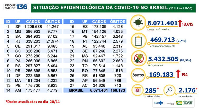 O balanço divulgado neste domingo (22) pelo Ministério da Saúde indica o acréscimo de 18.615 novos casos de covid-19 nas últimas 24 horas. No acumulado desde o início da pandemia já são 6.071.401 casos. Além disso, foram registradas 194 novas mortes, totalizando 169.183 óbitos. Além disso, 5.432.505 pessoas (89,5%) já estão curaram da doença.