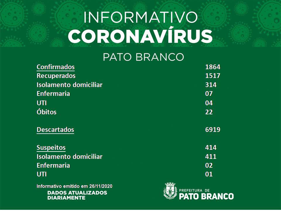 Boletim da Secretaria Municipal de Saúde informa o registro de novos em Pato Branco. De 1.851 para 1.864 casos de Covid-19, 22 óbitos, suspeitos 415, recuperados 1.517. Nove pacientes internados em enfermaria e 05 pacientes em UTI. Isolamento social 725. Casos descartados 6.919.