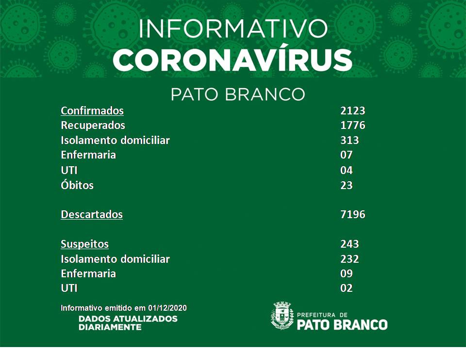 Boletim da Secretaria Municipal de Saúde informa o registro de   novos  em Pato Branco. De 2.018 para 2.123 casos de Covid-19, 23 óbitos, suspeitos 243, recuperados 1.776. Quinze pacientes internados em enfermaria e 06 pacientes em leitos de UTI. Isolamento social  551. Casos descartados 7.196.