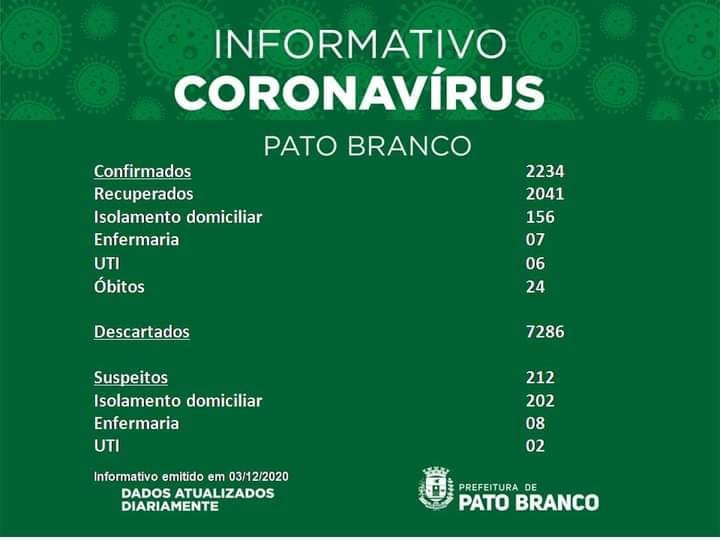 Boletim da Secretaria Municipal de Saúde informa o registro de novos em Pato Branco. De 2.164 para 2.234 casos de Covid-19, 24 óbitos, suspeitos 212, recuperados 2.041. 15 pacientes internados em enfermaria e 08 pacientes em leitos de UTI. Isolamento social 358. Casos descartados 7.286.