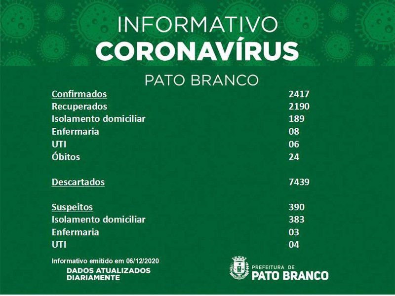 Boletim da Secretaria Municipal de Saúde informa o registro de novos em Pato Branco. De 2.407 para 2.413 casos de Covid-19, 25 óbitos, suspeitos 390, recuperados 2.190. 09 pacientes internados em enfermaria e 10 pacientes em leitos de UTI. Isolamento social 572. Casos descartados 7.439.