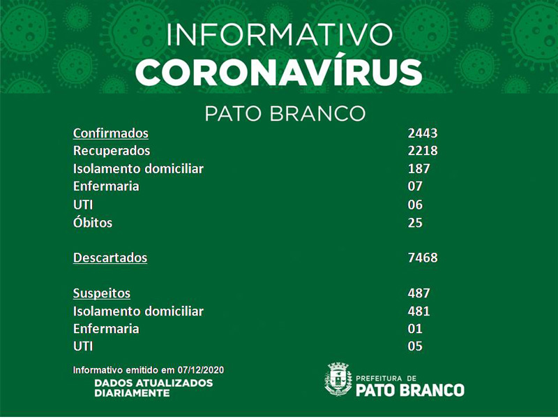Boletim da Secretaria Municipal de Saúde informa o registro de   novos  em Pato Branco. De 2.413 para 2.443 casos de Covid-19, 25 óbitos, suspeitos 487, recuperados 2.218. 08 pacientes internados em enfermaria e 11 pacientes em leitos de UTI. Isolamento social  668. Casos descartados 7.468.