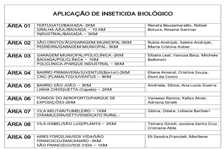 As secretarias municipais de Saúde e de Meio Ambiente, retomam nesta segunda-feira (07), as ações de combate ao borrachudo, com a aplicação da segunda etapa de inseticida biológico nos rios e córregos e lagos do município (área urbana e rural), para impedir o desenvolvimento de larvas do mosquito e reduzir sua proliferação. A aplicação na área urbana, realizada pelos agentes de endemias da Vigilância Sanitária será realiza durante toda a semana, nas áreas 01, 02, 03, 05 e 06. Para mais informações sobre a programação, entrar em contato pelo telefone: 3220-1506.