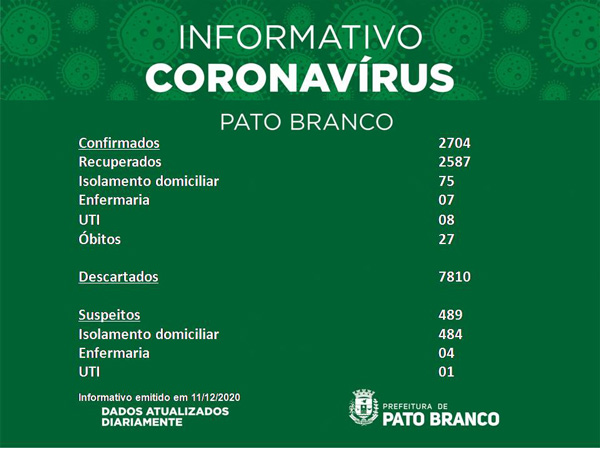 Boletim da Secretaria Municipal de Saúde informa o registro de novos em Pato Branco. De 2.654 para 2.704 casos de Covid-19, 27 óbitos, suspeitos 489, recuperados 2.587. 11 pacientes internados em enfermaria e 09 pacientes em leitos de UTI. Isolamento social 564. Casos descartados 7.810.