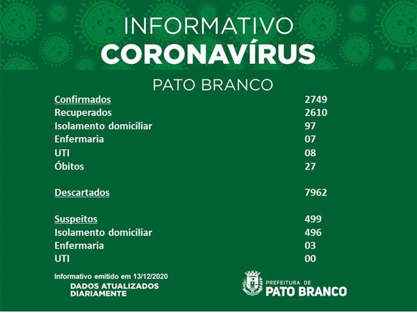 Boletim da Secretaria Municipal de Saúde informa o registro de novos em Pato Branco. De 2.704 para 2.749 casos de Covid-19, 27 óbitos, suspeitos 489, recuperados 2.610. 07 pacientes internados em enfermaria e 08 pacientes em leitos de UTI. Isolamento social 593. Casos descartados 7.810.