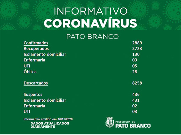 Boletim da Secretaria Municipal de Saúde informa o registro de novos em Pato Branco. De 2.863 para 2.889 casos de Covid-19, 28 óbitos, suspeitos 436, recuperados 2.723. 05 pacientes internados em enfermaria e 08 pacientes em leitos de UTI. Isolamento social 561. Casos descartados 8.258.
