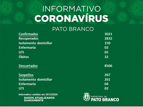 Boletim da Secretaria Municipal de Saúde informa o registro de novos em Pato Branco. De 3.002 para 3.021 casos de Covid-19, 32 óbitos, suspeitos 267, recuperados 2.832. 06 pacientes internados em enfermaria e 07 pacientes em leitos de UTI. Isolamento social 390. Casos descartados 8.506.
