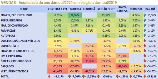 O maior crescimento do comércio foi verificado no Sudoeste, com aumento de 8,33%. Na região Oeste houve alta de 7,68%, seguida por Londrina (5,66%), Ponta Grossa (5,17%) e Curitiba e Região Metropolitana (3,16%). Porém, no acumulado do ano, as perdas mais expressivas são sentidas pelo varejo de Maringá, com baixa de 17,51%. Ponta Grossa é a região em que os comerciantes tiveram menos prejuízos com a pandemia, com -1,50%. Nas demais regiões, o cenário no somatório de janeiro a outubro também é de retração: Curitiba e RM (-4,41%), Oeste (-5,01%), Londrina (-7,00%) e Sudoeste (-5,77%)