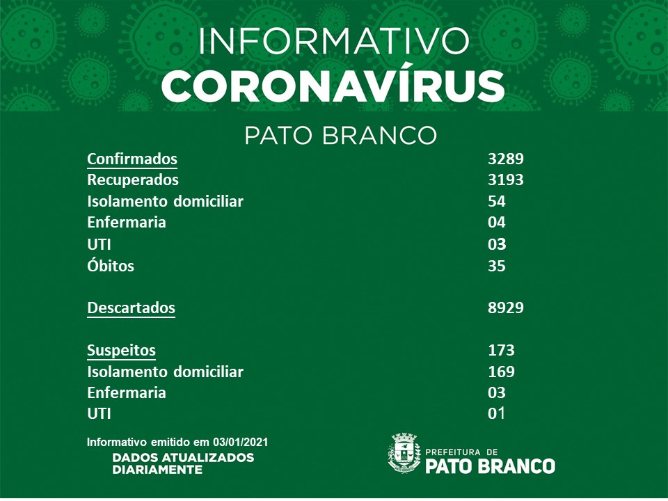 Boletim da Secretaria Municipal de Saúde informa o registro de   novos  em Pato Branco. De 3.258 para 3.289 casos de Covid-19, 35 óbitos,  suspeitos 173, recuperados 3.193. 07 pacientes internados em enfermaria e 04 pacientes em leitos de UTI. Isolamento social 223. Casos descartados 8.929..