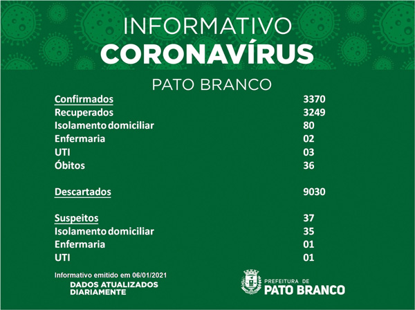 Boletim da Secretaria Municipal de Saúde informa o registro de novos em Pato Branco. De 3.338 para 3.370 casos de Covid-19, 36 óbitos, suspeitos 37, recuperados 3.249. 04 pacientes internados em enfermaria e 04 pacientes em leitos de UTI. Isolamento social 115. Casos descartados 9.030.