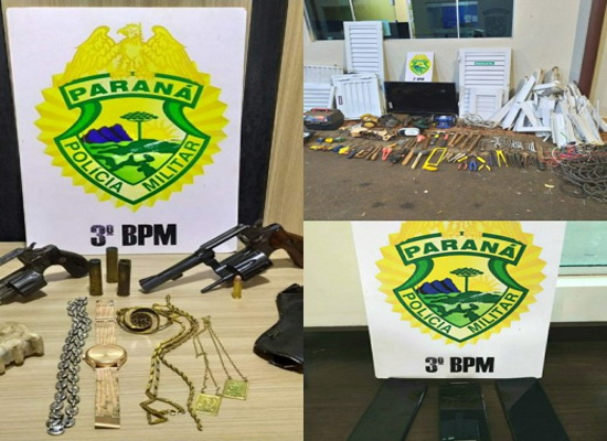 Na madrugada desta quarta-feira (06), policiais militares recuperaram três celulares furtados. Em outra situação, os policiais recuperam objetos de furtos, duas armas de fogo e a prisão de quatro indivíduos suspeitos de praticar os furtos e outro por receptação. Após informações que, o autor de um furto estava sendo contido por um colaborador de uma empresa de vigilância, a equipe realizou a prisão do indivíduo. Na sequência, se deslocaram até a residência. Ele informou que estava entregando os produtos de furto. Realizadas buscas e apreendidos diversos objetos de origem duvidosa (relógios, correntes, portas de alumínio, ferramentas, celulares, televisão, fios eletrônicos, fios de alta tensão, munições e duas armas de fogo, sendo 1 revólver marca Smith Wesson cal. 32 e 1 revólver marca Taurus cal. 38).