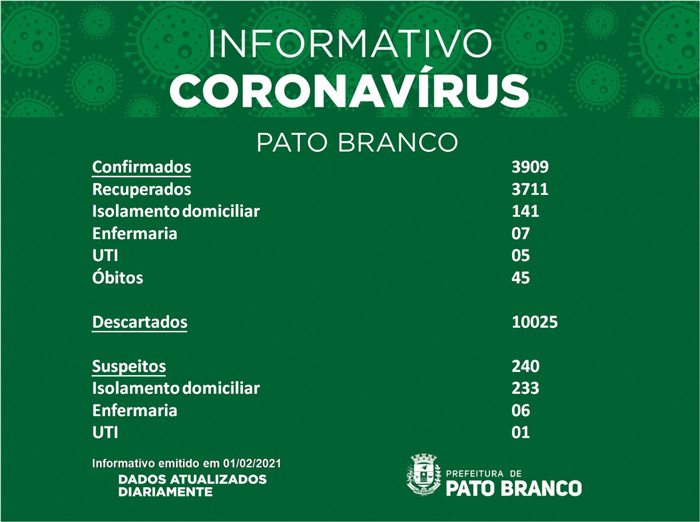 Boletim da Secretaria Municipal de Saúde informa o registro de novos em Pato Branco. De 3.880 para 3.909 casos de Covid-19, 45 óbitos, suspeitos 240, recuperados 3.771. 13 pacientes internados em enfermaria e 06 pacientes em leitos de UTI. Isolamento social 374. Casos descartados 10.025.