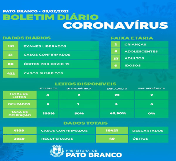 Boletim da Secretaria Municipal de Saúde informa o registro de novos em Pato Branco. De 4.058 para 4.109 casos de Covid-19, 49 óbitos, recuperados 3.959. 07 pacientes internados em enfermaria e 07 pacientes em leitos de UTI. UTI pediátrica 01 paciente. Casos descartados 10.421. Aguardando resultados: 432 pessoas. Em isolamento social: 88 pessoas. A Taxa de ocupação em UTI adulto é de 100%, UTI pediátrica 50% e de enfermaria é de 40,90%.