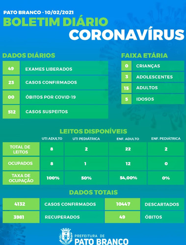 Boletim da Secretaria Municipal de Saúde informa o registro de novos em Pato Branco. De 4.109 para 4.132 casos de Covid-19, 49 óbitos, recuperados 3.981. 12 pacientes internados em enfermaria e 08 pacientes em leitos de UTI. UTI pediátrica 01 paciente. Casos descartados 10.447. Casos suspeitos: 512 pessoas. Em isolamento social: 88 pessoas. A Taxa de ocupação em UTI adulto é de 100%, UTI pediátrica 50% e de enfermaria é de 54,00%.