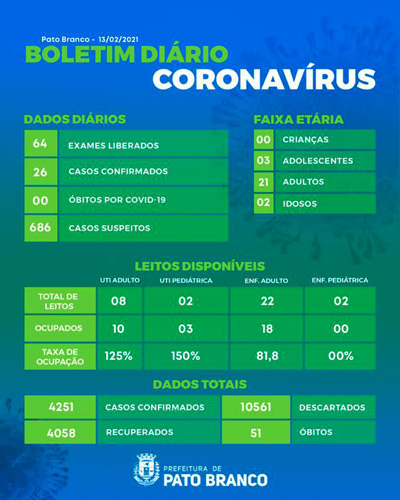 Boletim da Secretaria Municipal de Saúde informa o registro de novos em Pato Branco. De 4.225 para 4.251 casos de Covid-19, 51 óbitos, recuperados 4.058. 18 pacientes internados em enfermaria e 10 pacientes em leitos de UTI. UTI pediátrica 03 pacientes. Casos descartados 10.561. Casos suspeitos: 686 pessoas. A Taxa de ocupação em UTI adulto é de 125%, UTI pediátrica 150% e de enfermaria é de 81,8%.