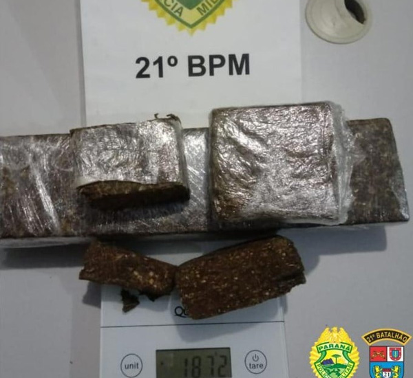 Na manhã desta quinta-feira, dia 18, policiais militares de serviço no município de Francisco Beltrão foram acionados para atender uma situação de perturbação do sossego. Ao chegarem ao local, foram recepcionados pela moradora no portão, sendo possível observar a movimentação de pessoas no interior da casa. Os policiais puderam visualizar que um homem arremessou um objeto por uma das janelas e ao ser questionada a moradora disse que não era nada. Foi adentrado ao local e localizado duas porções de maconha que juntas pesavam 340 (trezentas e quarenta) gramas.