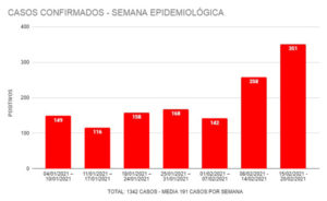 Janeiro 2021- Dia 01, 10 casos. Dia 02, 09 casos. Dia 03, 31 casos. Dia 04 e 5, 49 casos. Dia 06, 32 casos. Dia 07, 22 casos. Dia 08, 23 casos. Dia 09, 04 casos. Dia 10, 19 casos. Dia 11, 11 casos. Dia 12, 21 casos. Dia 13, 25 casos. Dia 14, 13 casos. Dia 15, 18 casos. Dia 16, 13 casos. Dia 17, 15 casos. Dia 18, 14 casos. Dia 19, 29 casos. Dia 20, 8 casos. Dia 21, 34 casos. Dia 22, 26 casos. Dia 23, 24 casos. Dia 24, 13 casos. Dia 25, 19 casos. Dia 26, 14 casos. Dia 27, 15 casos. Dia 28, 62 casos. Dia 29, 12 casos. Dia 30, 23 casos. Dia 31, 22 casos. Total: 649 casos.