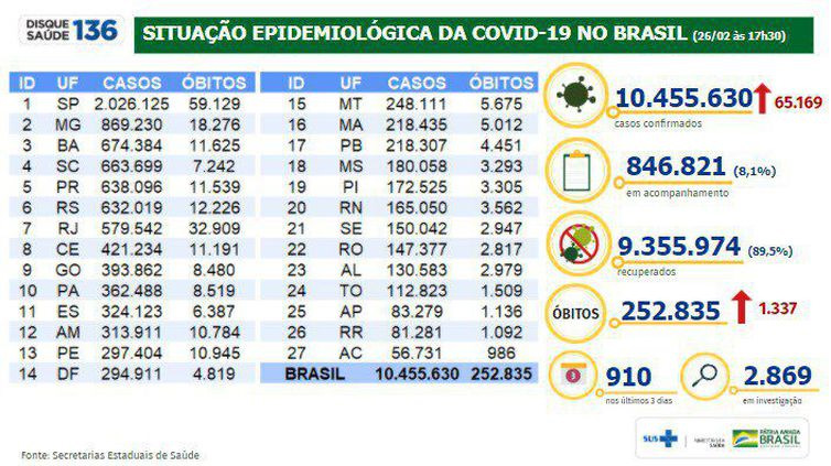 O Ministério da Saúde relata que 1.337 óbitos foram confirmados desde a última publicação do informe. O número total de mortes é de 252.835 – 2,41% dos infectados. Mais de 9,3 milhões de pessoas se recuperaram da doença, o equivalente a 89,5% do total.