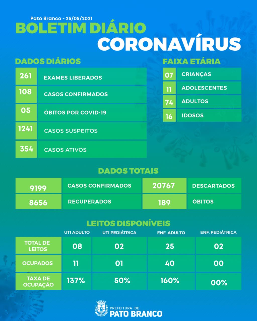 Boletim da Secretaria Municipal de Saúde informa o registro de novos em Pato Branco. De 8.091 para 9.119 casos de Covid-19, 189 óbitos, recuperados 8.656. 40 pacientes internados em enfermaria, 11 pacientes em leitos de UTI. UTI pediátrica 01 paciente. Enfermaria Pediátrica 00 paciente. Casos descartados 20.767. Aguardando resultados 1.241 pessoas em Isolamento domiciliar, casos ativos 352 pessoas. A Taxa de ocupação em UTI adulto é de 137%, UTI pediátrica 50 % e de enfermaria adulto é de 160%. Enfermaria Pediátrica 00%.Mais detalhes, clique aqui.