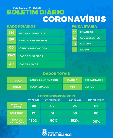 Boletim da Secretaria Municipal de Saúde informa o registro de novos em Pato Branco. De 10.285 para 10.369 casos de Covid-19, 213 óbitos, recuperados 9.840. 38 pacientes internados em enfermaria, 12 pacientes em leitos de UTI. UTI pediátrica 01 paciente. Enfermaria Pediátrica 00 pacientes. Casos descartados 23.007. Aguardando resultados 1.562 pessoas que estão em Isolamento domiciliar, casos ativos 316 pessoas. A Taxa de ocupação em UTI adulto é de 150%, UTI pediátrica 50 % e de enfermaria adulto é de 152%. Enfermaria Pediátrica 00%.Mais detalhes, clique aqui.