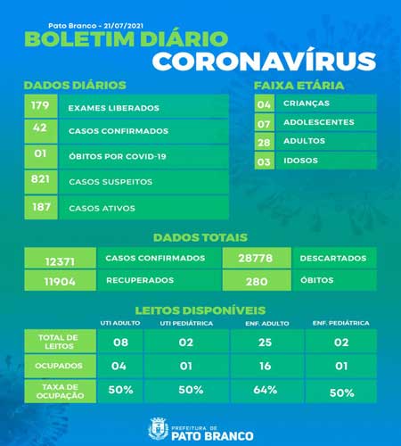Boletim da Secretaria Municipal de Saúde informa o registro de novos em Pato Branco. De 12.329 para 12.371 casos de Covid-19, 280 óbitos, recuperados 11.904. 16 pacientes internados em enfermaria, 04 pacientes em leitos de UTI. UTI pediátrica 01 paciente. Enfermaria Pediátrica 01 paciente. Casos descartados 28.778. Aguardando resultados 821 pessoas que estão em Isolamento domiciliar, casos ativos 187 pessoas. A Taxa de ocupação em UTI adulto é de 50%, UTI pediátrica 50 % e de enfermaria adulto é de 64%. Enfermaria pediátrica 50%.Mais detalhes, clique aqui.