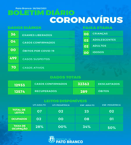 Boletim da Secretaria Municipal de Saúde informa o registro de novos em Pato Branco. De 12.929 para 12.933 casos de Covid-19, 289 óbitos, recuperados 12.574. 08 pacientes internados em enfermaria, 02 pacientes em leitos de UTI. UTI pediátrica 00 paciente. Enfermaria Pediátrica 01 paciente. Casos descartados 32.362. Aguardando resultados 490 pessoas que estão em Isolamento domiciliar, casos ativos 70 pessoas. A Taxa de ocupação em UTI adulto é de 28%, UTI pediátrica 00% e de enfermaria adulto é de 34%. Enfermaria pediátrica 50%.