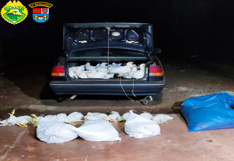 Os detidos informaram que, para adentrar no terreno para subtrair as aves cortaram a cerca de proteção e no aviário cortaram a tela de aço e a cortina de lona. No aviário foram contabilizados 68 frangos vivos, 12 mortos e aproximadamente 120 kg de ração, totalizando um prejuízo de aproximadamente R$ 3.440,00, além dos danos estruturais. Os abordados foram encaminhados juntamente com o veículo apreendido para as providências legais cabíveis.