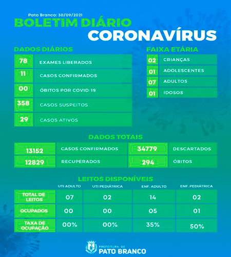 Boletim da Secretaria Municipal de Saúde informa o registro de   novos  em Pato Branco. De 13.141 para 13.152 casos de Covid-19, 294 óbitos, recuperados 12.829. 05 pacientes internados em enfermaria, 00 paciente em leitos de UTI.  UTI pediátrica 00 paciente. Enfermaria Pediátrica 01 paciente.  Casos descartados 34.779 Aguardando resultados 358 pessoas que estão em Isolamento domiciliar, casos ativos 29 pessoas. A Taxa de ocupação em UTI adulto é de 00%, UTI pediátrica 00% e de enfermaria adulto  é de 35 %. Enfermaria pediátrica 50%.