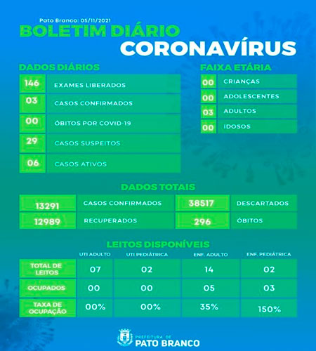 Boletim da Secretaria Municipal de Saúde informa o registro de novos em Pato Branco. De 13.288 para 13.291 casos de Covid-19, 296 óbitos, recuperados 12.989. 05 pacientes internados em enfermaria, 00 paciente em leitos de UTI. UTI pediátrica 00 pacientes. Enfermaria Pediátrica 03 pacientes. Casos descartados 38.517. Aguardando resultados 29 pessoas que estão em Isolamento domiciliar, casos ativos 06 pessoas. A Taxa de ocupação em UTI adulto é de 00%, UTI pediátrica 00% e de enfermaria adulto é de 35 %. Enfermaria pediátrica 150%.