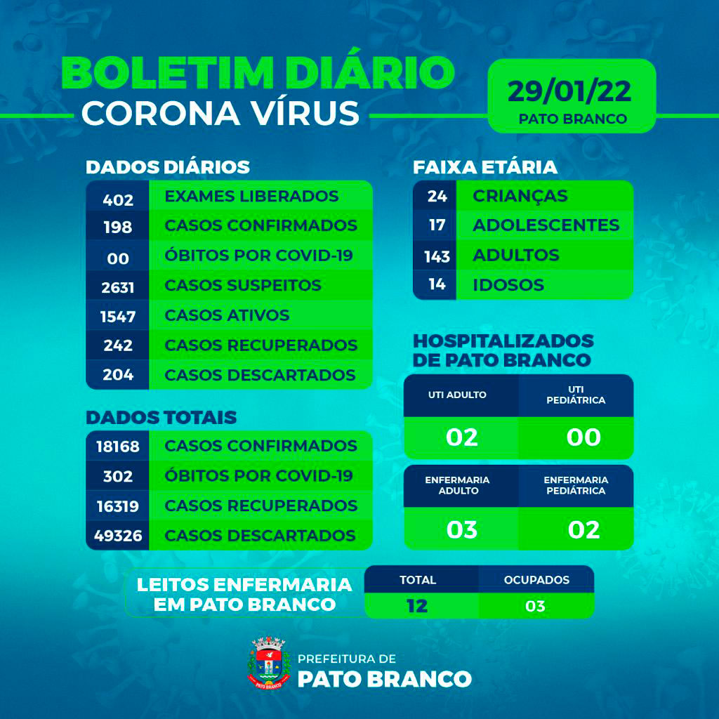 Boletim da Secretaria Municipal de Saúde informa o registro de novos casos em Pato Branco. De 17.970 para 18.168 casos de Covid-19, 302 óbitos, recuperados 16.313. 03 pacientes internados em enfermaria, 02 pacientes em leitos de UTI. UTI pediátrica 00 paciente. Enfermaria Pediátrica 02 pacientes. Casos descartados 49.326. Aguardando resultados 2631 pessoas, que estão em Isolamento domiciliar e casos ativos 1547. Diário: 242 recuperados e 204 descartados