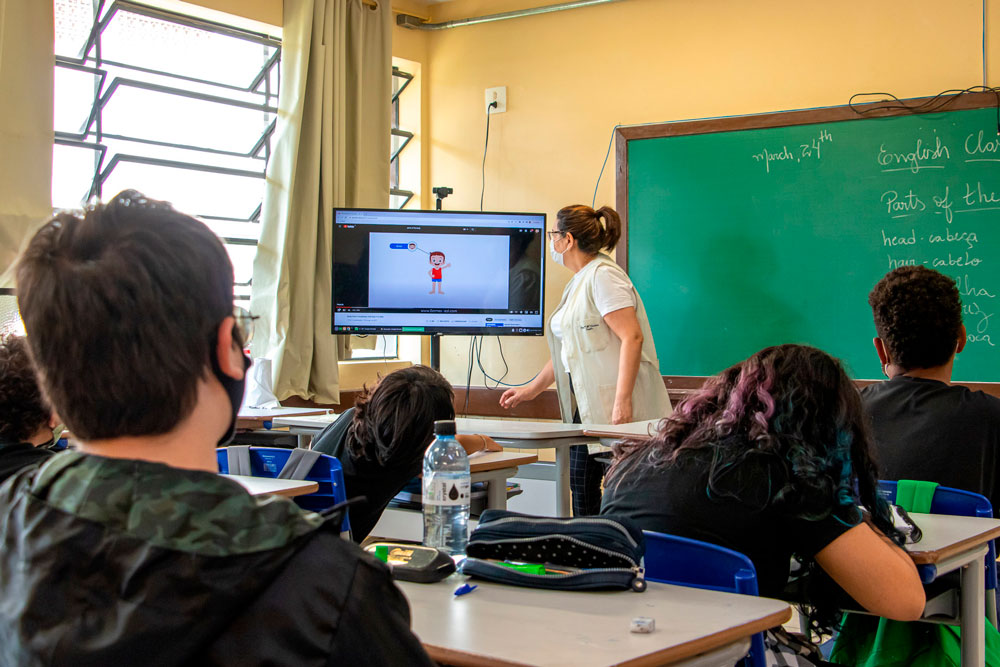 No Colégio Estadual Pedro Macedo, em Curitiba, a professora Maria Cristina Pereira usa o Educatron em suas aulas de inglês. Quando um estudante tem dúvida sobre a pronúncia de uma palavra, ela abre um dicionário online, que mostra, além do significado, a pronúncia correta. “Quando a gente precisa fazer uma pesquisa, consegue fazer na hora. Tem o YouTube para mostrar vídeos relacionados ao conteúdo, músicas. É uma ferramenta que está ajudando muito”, conta a professora.