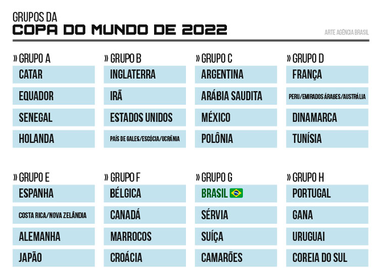 O Brasil terá Sérvia, Suíça e Camarões pela frente no Grupo G da Copa do Mundo deste ano. O sorteio foi realizado no Centro de Exibições e Convenções de Doha, no Catar, país sede da competição, que será disputada entre 21 de novembro e 18 de dezembro deste ano. O jogo de abertura do Mundial será entre Senegal e Holanda.