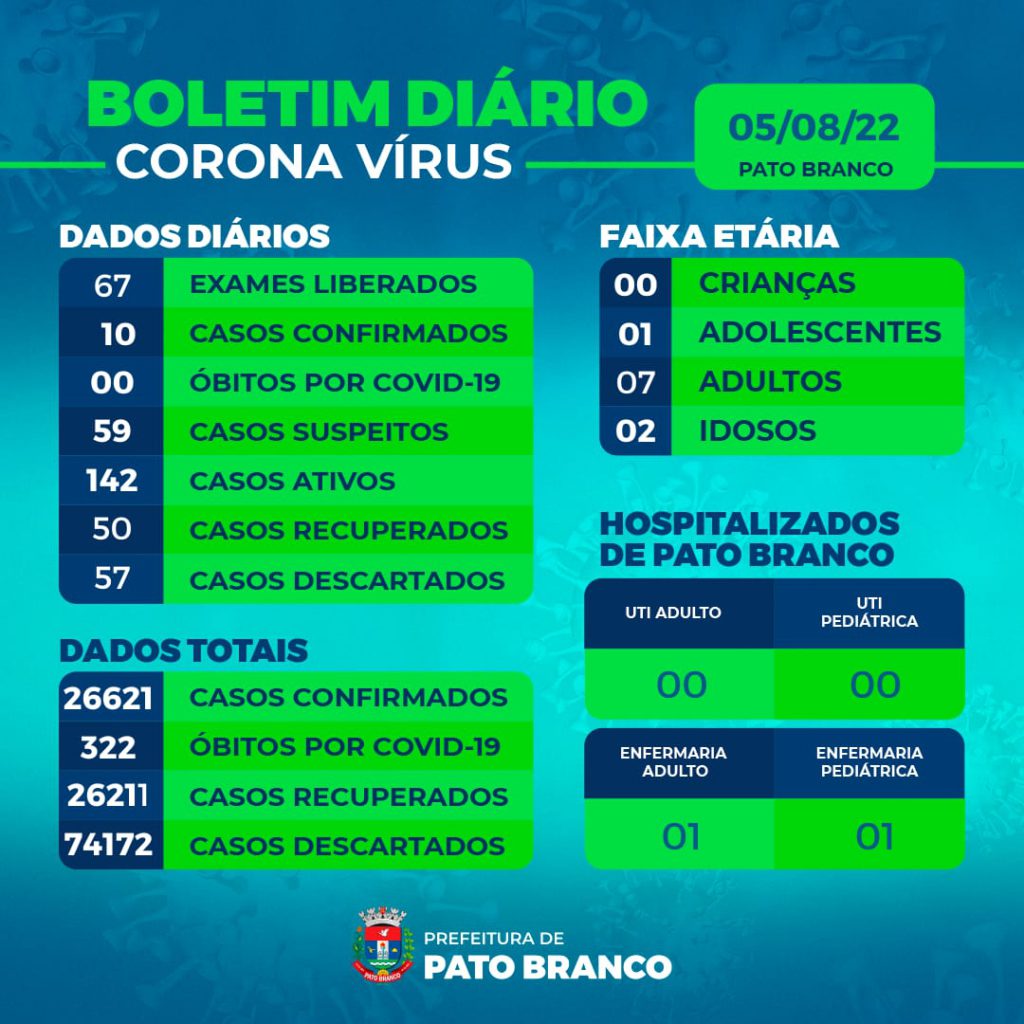 Boletim da Secretaria Municipal de Saúde informa o registro de   novos casos em Pato Branco. De 26.611  para 26.621 casos de Covid-19, 322 óbitos, recuperados 26.211. 01 pacientes internados em enfermaria, 00  pacientes em leito de UTI.  UTI pediátrica 00 pacientes. Enfermaria Pediátrica 01 pacientes.  Casos descartados 74.172 Aguardando resultados 59 pessoas e casos ativos 142.  Diário: 50 recuperados e 57 descartados.