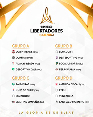 A Conmebol (Confederação Sul-Americana de Futebol) sorteou nesta terça-feira (20) os grupos da Libertadores Feminina, competição que será disputada entre os dias 13 e 28 de outubro na cidade de Quito (Equador). E o Brasil será representado na competição por Corinthians, Palmeiras e Ferroviária. O Timão, atual campeão continental, é o cabeça de chave do Grupo A, que também conta com a presença de Olimpia (Paraguai), Always Ready (Bolívia) e Deportivo Cali (Colômbia).