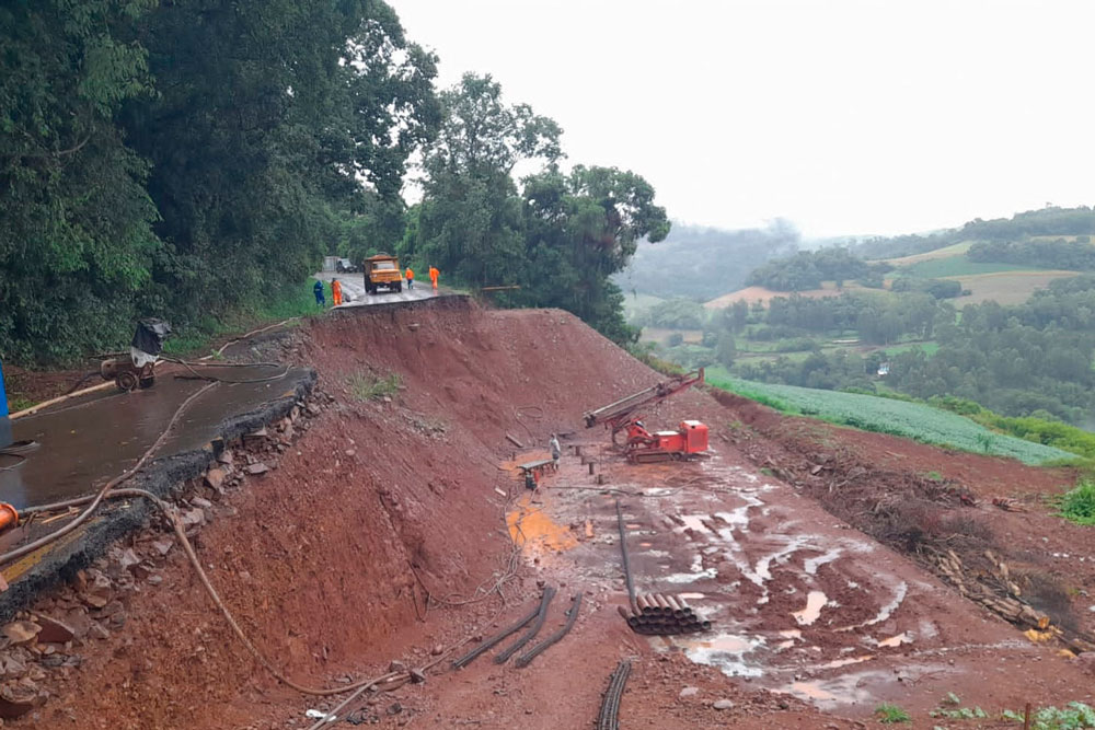 O Departamento de Estradas de Rodagem do Paraná (DER/PR) está realizando os trabalhos de terraplanagem e execução do muro de contenção da PR-182, em Salgado Filho, no Sudoeste do Estado. O trecho do km 588 da rodovia, que dá acesso ao município de Flor da Serra do Sul, foi destruído após um deslizamento de terra causado pelas fortes chuvas em outubro do ano passado. As obras começaram em novembro, com os primeiros dois meses dedicados principalmente ao projeto executivo, mobilização, canteiro de obras e coleta de informações através de sondagens geotécnicas.