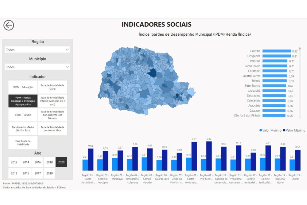 “Além dos dados de cada região paranaense, estão disponíveis informações de todos os 399 municípios, que vêm de fontes nacionais – tanto do IBGE, como de diversos ministérios, como os da Educação e da Saúde –, e também dados de institutos do Paraná, como do Ipardes, e do Detran-PR, o que faz dela uma grande ferramenta que vai ajudar no planejamento tanto dos municípios, quanto das 15 regiões do programa Paraná Produtivo”, complementa.